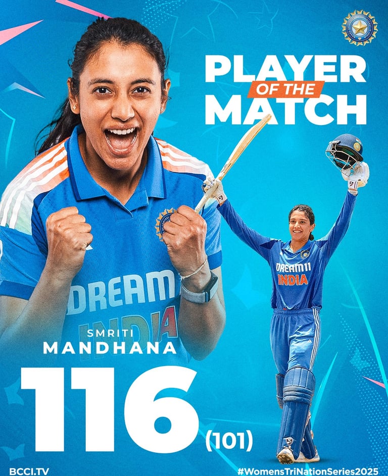 The India Women’s team defeated Sri Lanka by 97 runs on Sunday to clinch the Tri-Nation ODI Series title. Smriti Mandhana was named Player of the Match for her explosive century, scoring 116 runs off just 101 balls.
